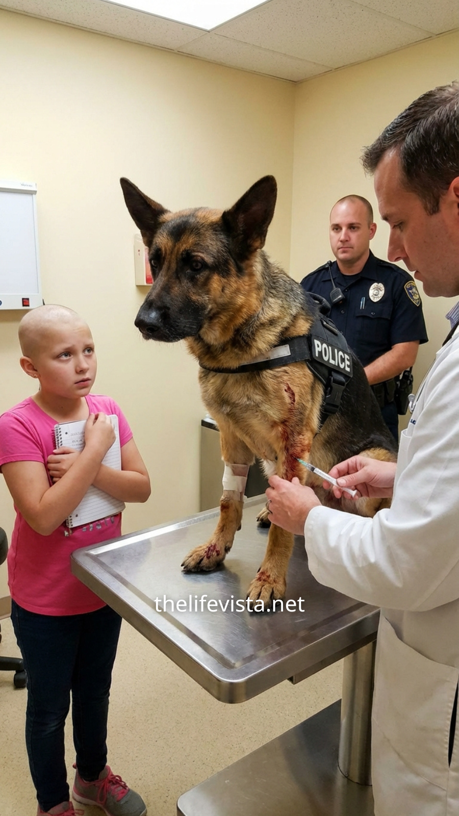 Sadie leaned close to Titan’s ear and whispered something no one else could hear. Titan’s eyes blinked slowly, and for the first time since arriving, he let the vet reach for his wound.