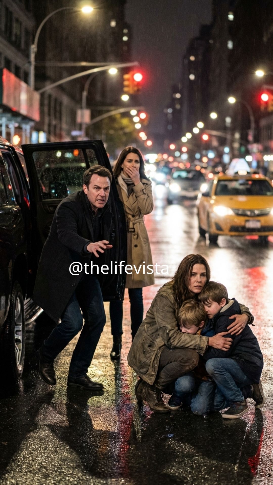 A woman stepped off the curb with two small boys at her sides, each of them holding one of her hands as if she were the whole center of the world and they were anchored to her by instinct. She wore a plain coat and sneakers, her hair pulled into a messy knot. She wasn’t dressed for the night, for the city, or for anyone’s attention. She looked like she had been living inside a storm for so long that survival had replaced style, and yet he recognized her instantly.
