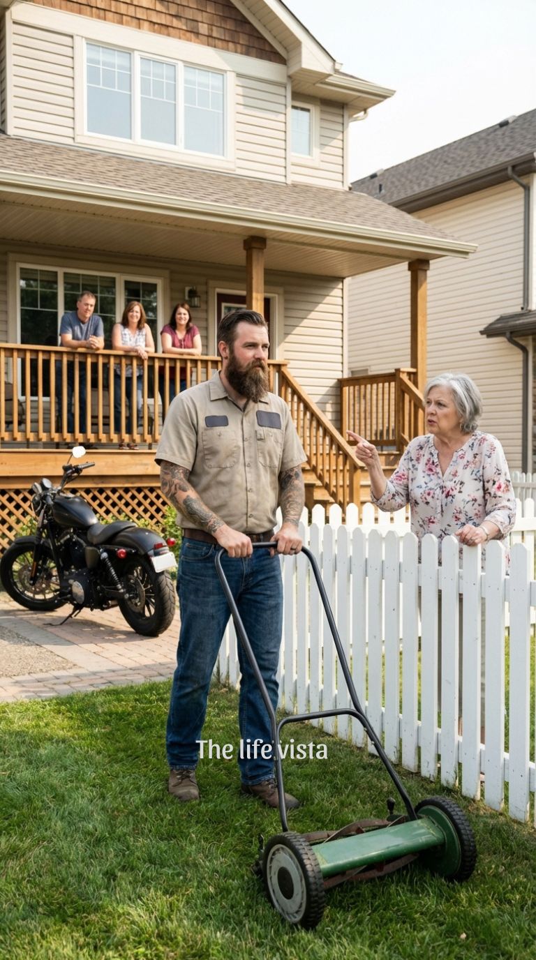 That first Sunday, Mrs. Whitmore had opened the door slowly when he knocked. “Yes?” she asked, voice careful but kind. “Ma’am,” he said, removing his gloves before speaking, “your grass is about knee-high.”