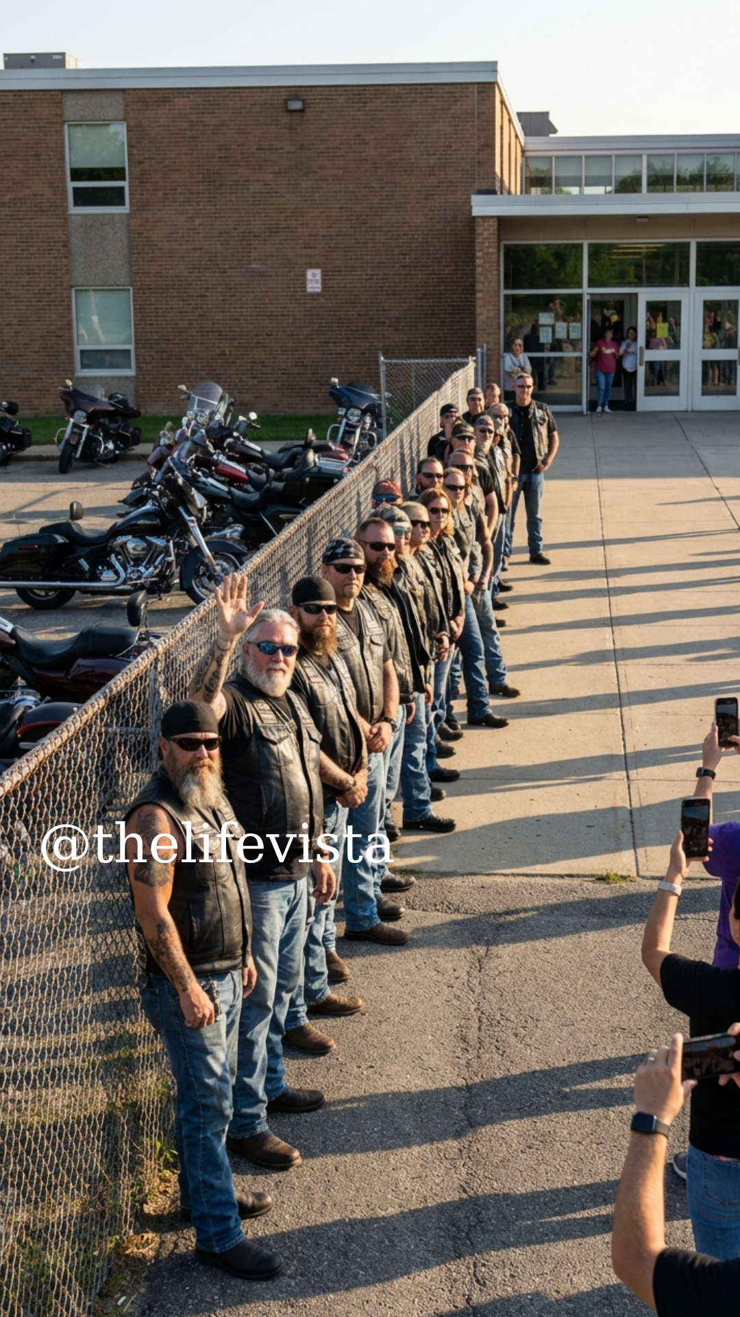 Phones appeared instantly. Within seconds people were filming, because the moment looked exactly like something dangerous: a biker gang blocking the gate of a middle school during dismissal.