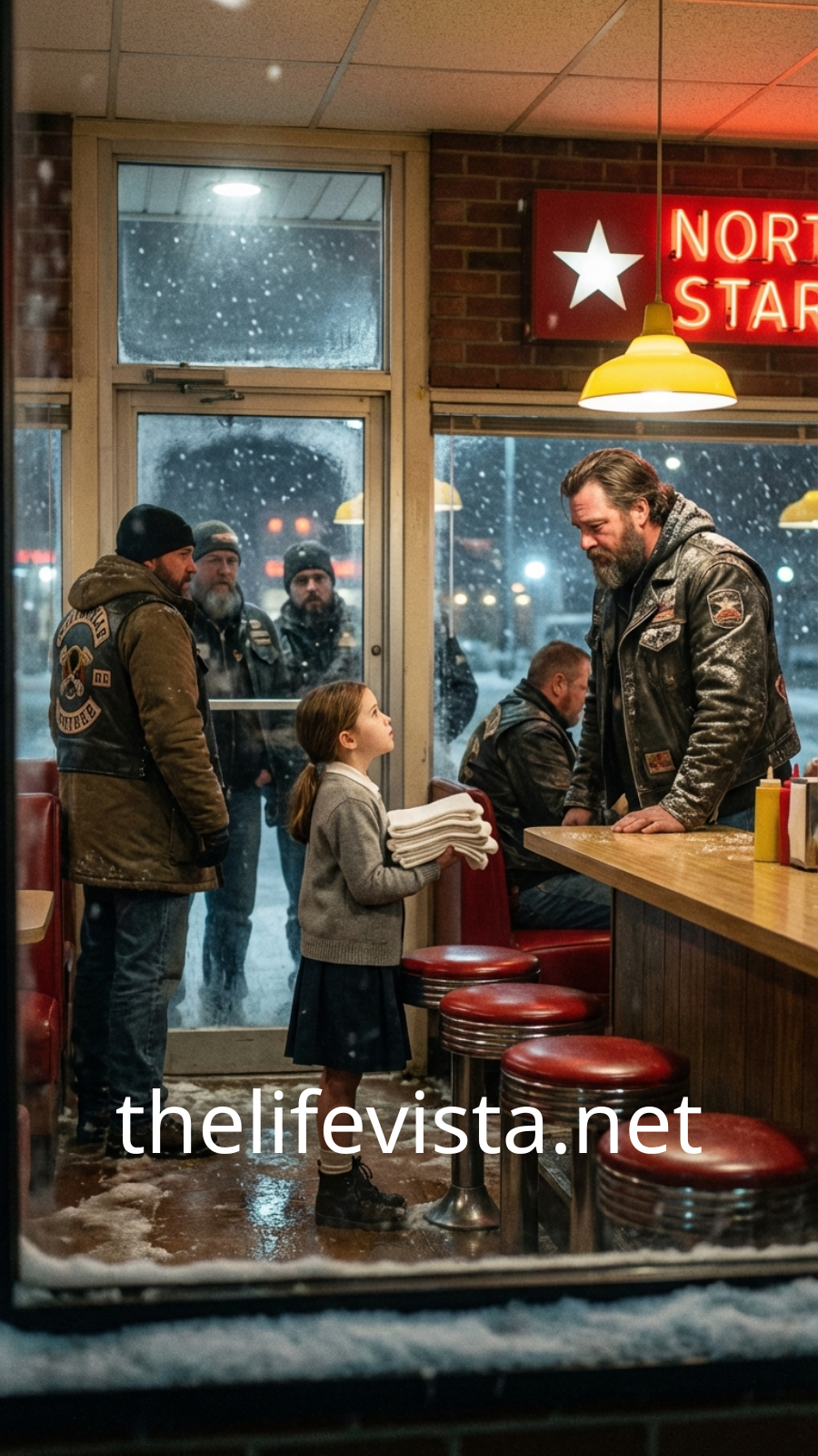 He didn’t flinch. He poured coffee and slid mugs down the counter like habit against fear. Steam curled upward. Lily, braver than her tiny frame looked, grabbed clean towels and started handing them out with her shy smile.