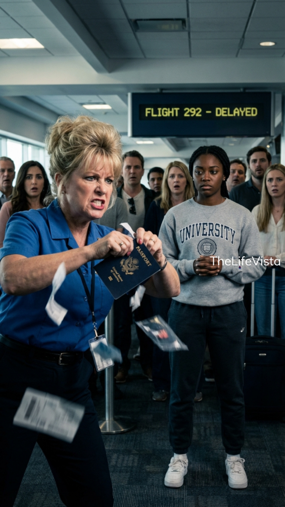 The silence that followed the ripping of the passport was profound. It was a vacuum, a void where the normal hum of the airport had been. Every eye at gate B32 was now locked on the scene at the boarding counter.