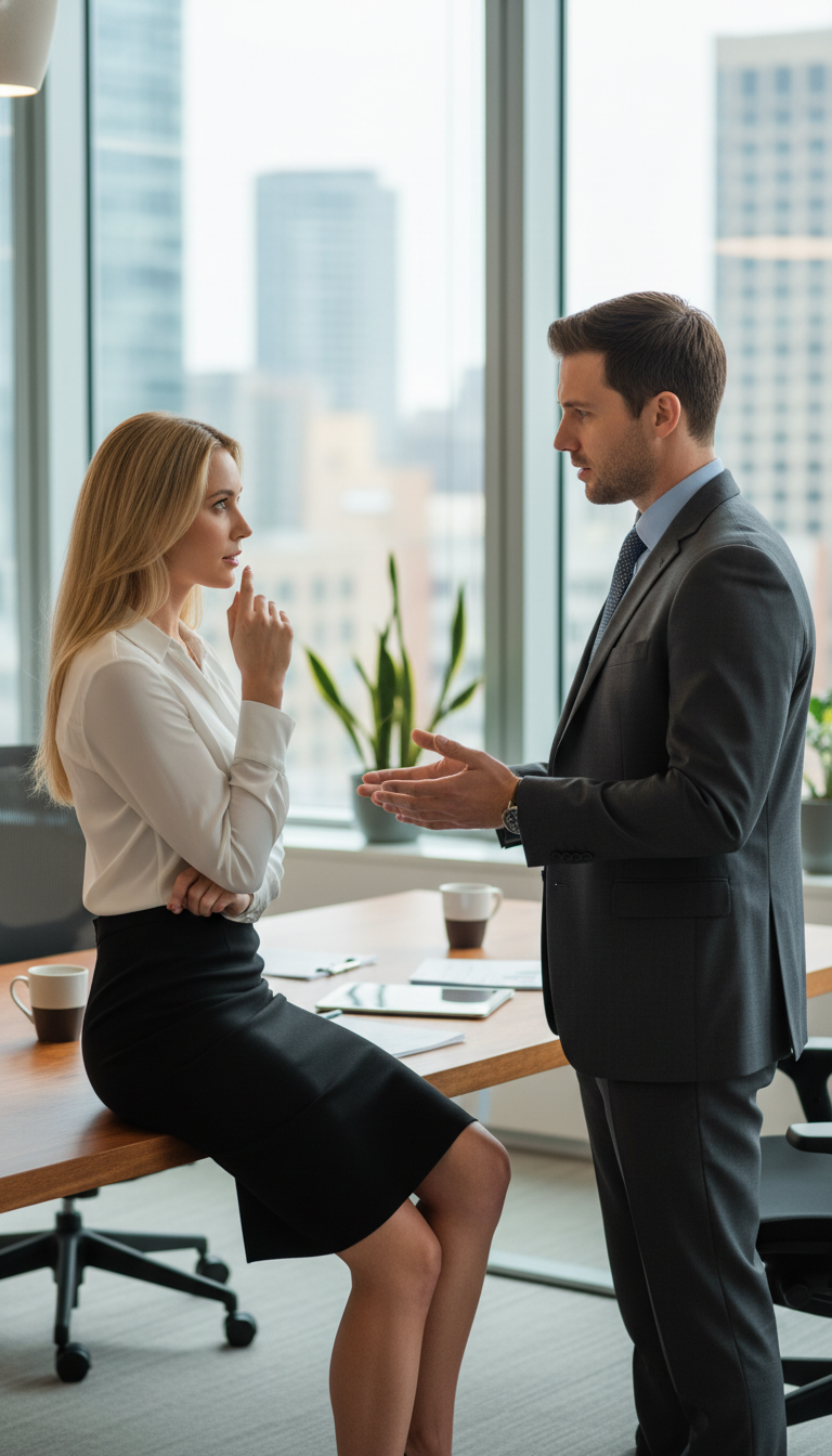 Samuel Voss, CFO, sauntered into her office with photographs—her at Adrian’s apartment, the kiss in the hallway.