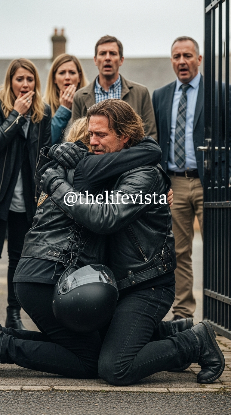 “For Three Years, the ‘Silent Biker’ at the School Gate Was the Target of Every Parent’s Fear, Refusing to Ever Lift His Tinted Visor—Until One Morning, a Little Boy Lunged Into His Arms With a Scream of ‘Dad!’ As the Helmet Finally Came Off, the Teachers Didn’t See a Criminal; They Saw a Face That Explained Exactly Why the Town’s Greatest Hero Had Been Hiding in the Shadows.”