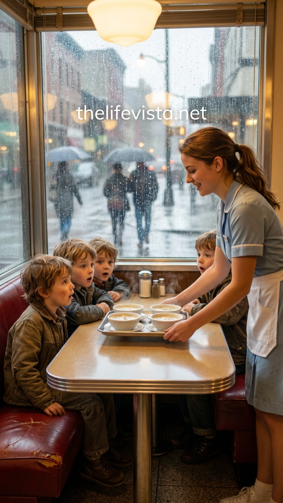 One rainy afternoon many years ago, she noticed them for the first time — four little girls sitting outside the diner window. They were soaked through, their thin clothes clinging to their bodies. A single old blanket covered them all, and their hair was messy from the rain.