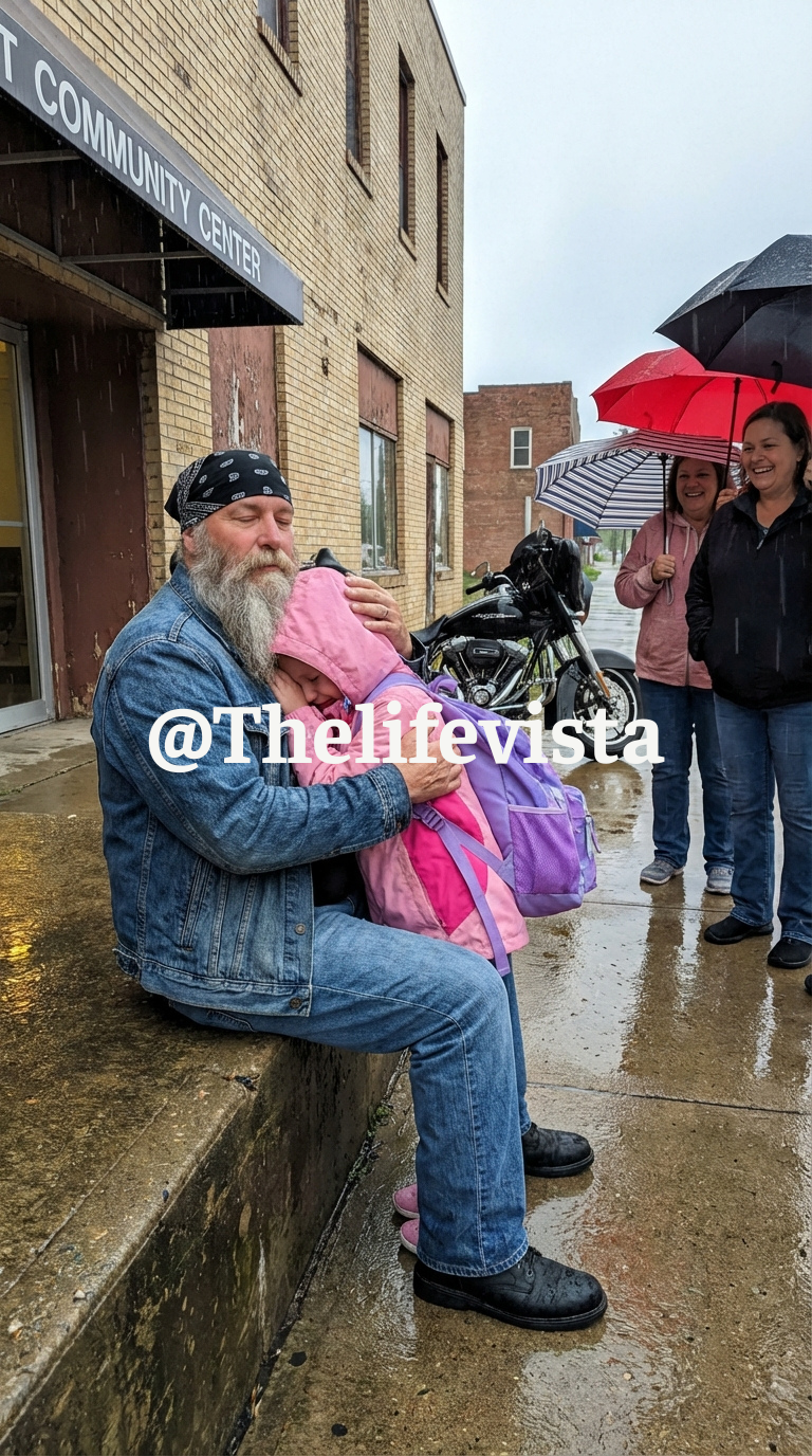 A little girl with soaked pigtails burst through the doors, her pink backpack half-zipped, shoes splashing through puddles. She looked panicked, scanning the crowd wildly. Her eyes landed on the biker—and without hesitation, she ran.