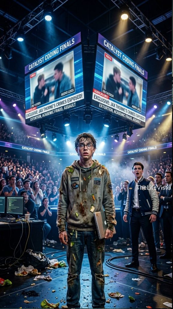 The first clip played before Derek understood the screens were no longer his friend. A second earlier, he was still standing over my broken laptop like a king in a digital arena, garbage dripping off my hoodie while his little crowd waited for the room to laugh on command. Then the main wall behind him lit up with crystal-clear footage of him shoving a freshman into a server rack two months earlier. No music. No editing. No mercy. Just Derek, huge and ugly above the finals stage, doing exactly what rich boys do when they think nobody important is watching.