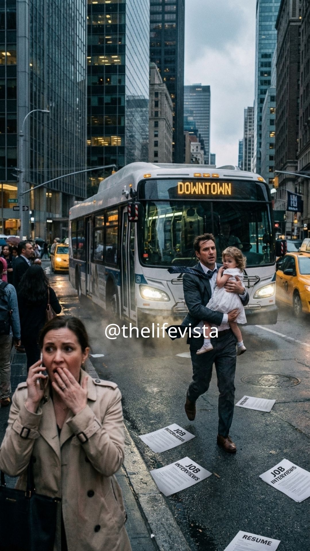 Instinct took over before fear had time to settle. Jordan dropped his folder and sprinted forward, lunging just as the bus’s horn blared through the street. He grabbed the girl and rolled with her onto the pavement as the bus screeched to a stop, missing them by inches. The world blurred into noise, motion, and pounding adrenaline before everything went still.