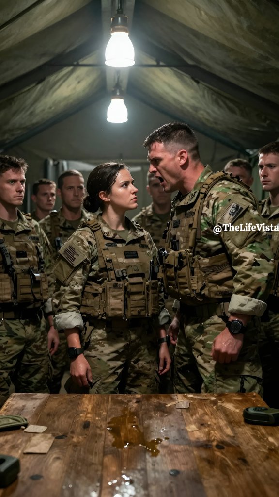 The shove was not accidental or careless, and it did not happen because the crowded recreation tent forced two people too close together beneath its sagging canvas ceiling. It was a deliberate movement filled with weight and intent, delivered through a broad shoulder that struck her with enough force to ripple through the thick heat of the room. The impact splashed cold beer across the front of her olive-green fatigues, soaking into fabric designed for cold winds and unforgiving terrain rather than sticky floors and music that pulsed through cheap speakers. The liquid spread quickly across her chest, the chill pressing against her skin while laughter drifted across the room. Yet the woman did not stumble or sway even slightly as the noise and tension settled around her.