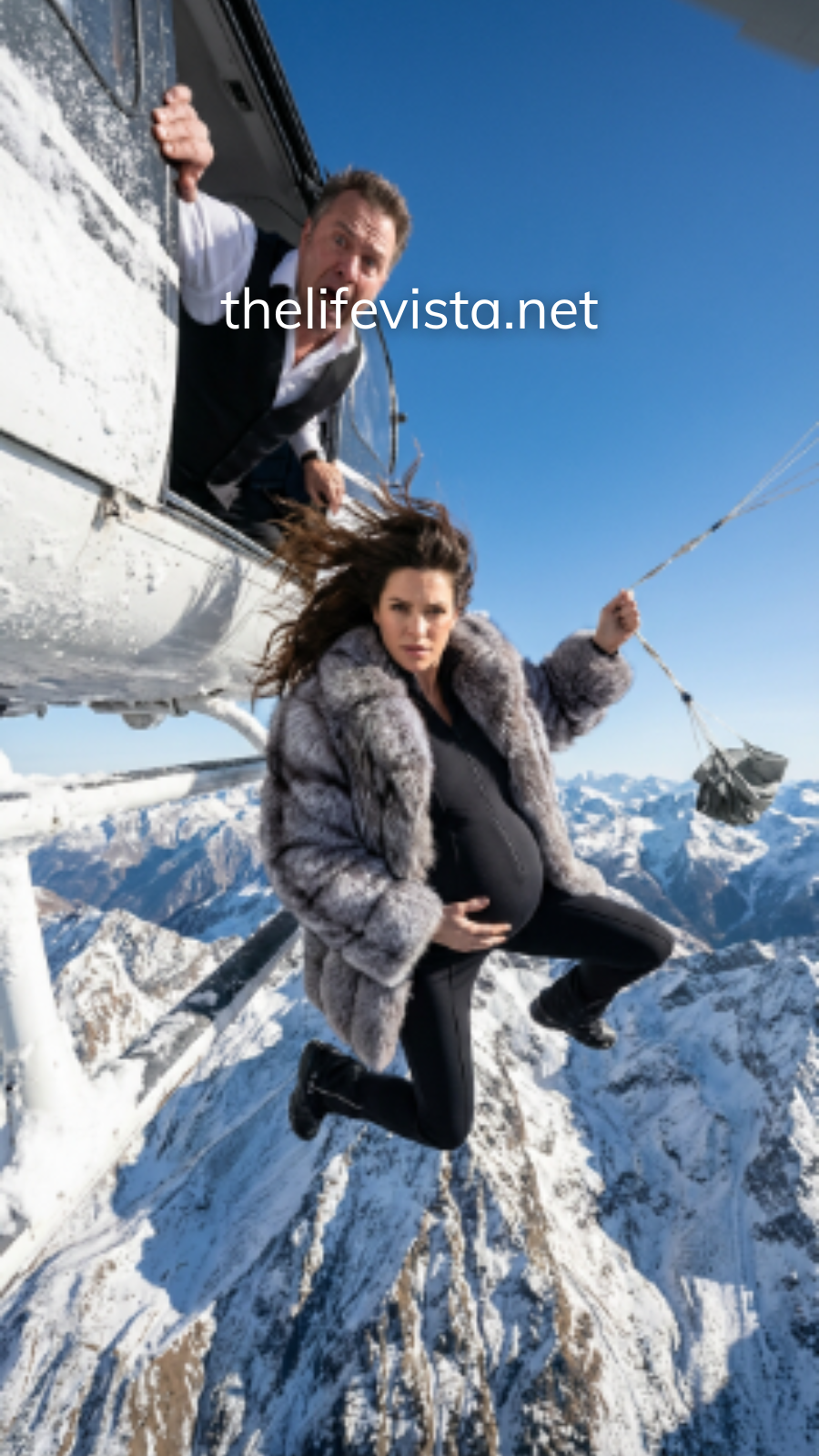 Evelyn hit the snow-covered slope hard, rolling once as pain shot through her shoulder and her ribs screamed in protest. The parachute dragged her several yards before snagging on a cluster of rocks and snapping taut. She lay still for a beat, breath shaking, one hand instinctively pressed over her belly as if her body could shield her child through sheer will.