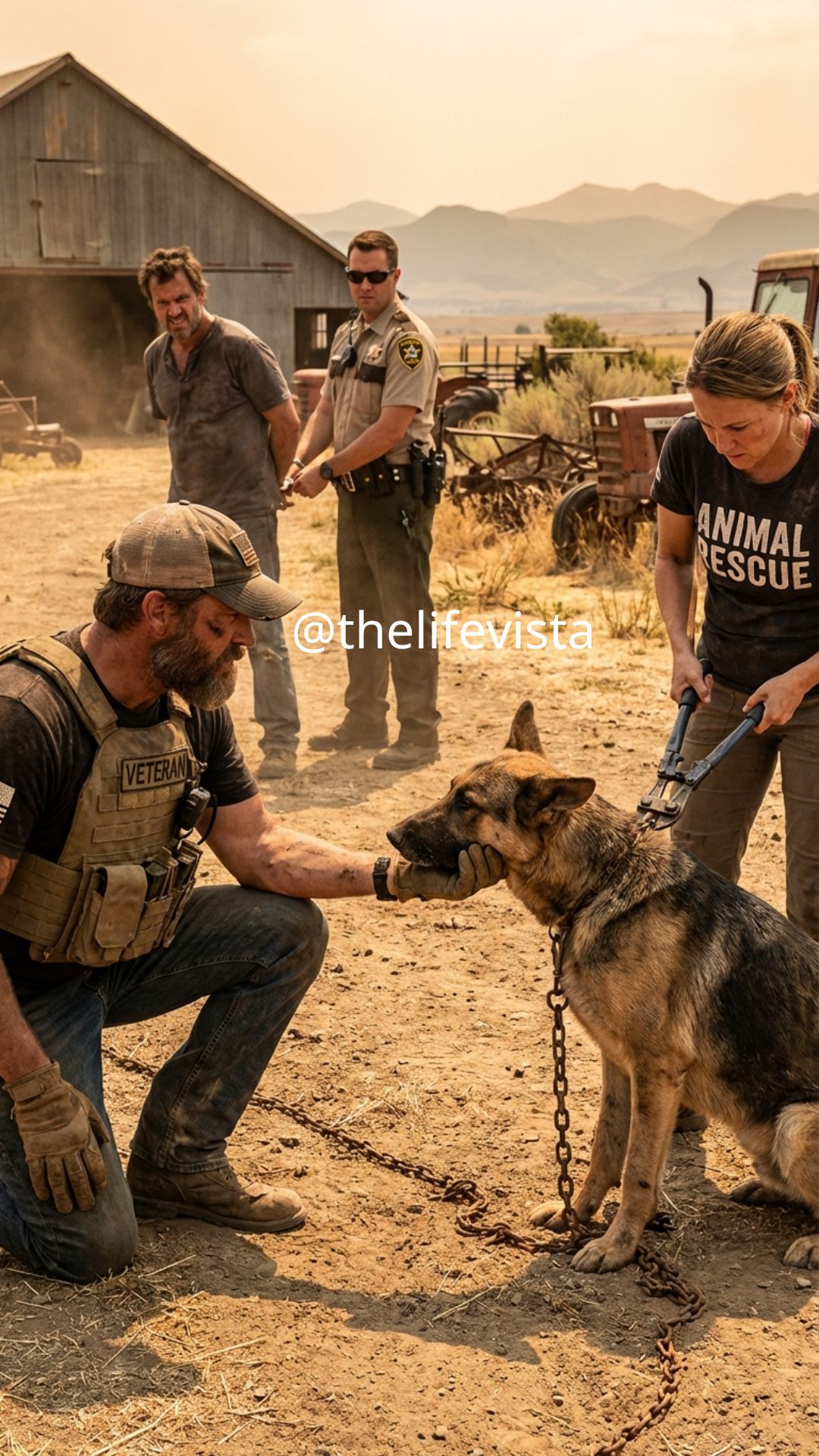 The man at the gate introduced himself as Travis Cole, and he did it with the confidence of someone who had been excused too many times in the past to expect any real consequences now. He was broad through the chest, sunburned at the neck from long days working outdoors, and wearing the kind of worn work clothes that men often used as camouflage for cruelty hidden in plain sight. Logan had seen the type before in other countries and other uniforms: people who mistook raw control for genuine strength and pain for a necessary form of obedience. Behind Travis Cole, the German Shepherd lifted its head once more, tried to shift its weight, and failed when the chain on its rear leg pulled tight with a metallic clank. Logan kept his hands visible and his voice flat and even. “Animal rescue and county deputies are already on their way here right now.”