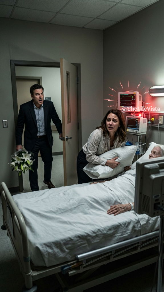 Freed from the suffocating pillow, Linda gasped violently for air. The sound that escaped her throat was hoarse and desperate, a choking gasp that Daniel would remember for the rest of his life. The heart monitor shrieked in chaotic rhythm beside the bed. The lilies slipped from Daniel’s fingers and scattered across the floor.