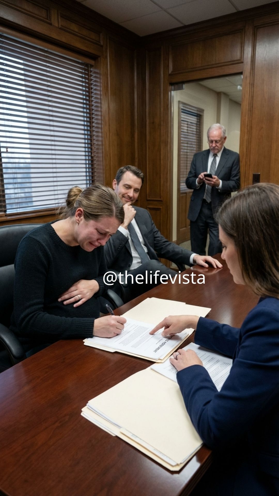 The divorce office smelled like lemon cleaner and cheap air freshener, the kind used to make ugly things feel “professional,” as if scent alone could disguise the sharp edges of conversations meant to dismantle lives. Olivia Parker sat at a narrow conference table in Seattle, one hand resting on the gentle curve of her stomach, the other clutching a tissue she’d already soaked through, while the quiet hum of fluorescent lights above her seemed far too loud for a moment that felt so fragile and painfully final. The room was designed to look neutral and calm, yet every surface seemed to reflect the tension that hung between the people seated there, turning an ordinary office into a place where promises quietly died.