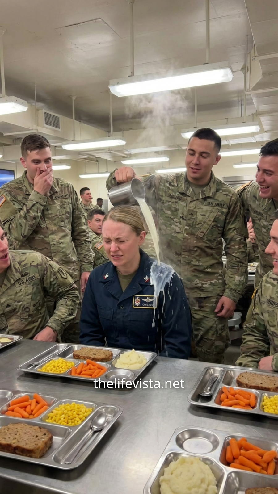 The carton burst open, and a stream of steaming milk splashed across the woman’s sleeve and chest. It stopped being an accident the moment Briggs laughed—sharp, careless, loud enough for half the cafeteria to hear.