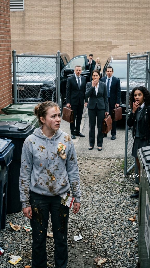 He shoved me hard enough to h!t the side of the bin. Then the garbage bag came down over me. Cold leftovers. Sour milk. Wet paper. Rotten fruit. And his line — Now you match what you came from — landed so hard that even the janitor by the loading gate looked sick.