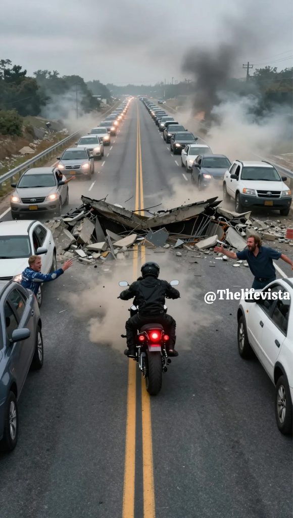 By nightfall, the news had his photo everywhere. Commentators called him a hero with solemn voices, and strangers posted prayers with shaky phone videos and grainy screenshots from dashcams. Drivers who had screamed at him were suddenly on camera with red eyes, voices breaking, admitting what they’d done. A man with two children said he’d been two cars behind the bike, and if the biker hadn’t forced the line to stall, his kids would have been directly over the collapse.