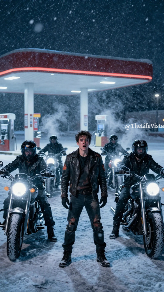 They kept coming, and the sound swelled until it felt like an earthquake made of steel and fury. Bikes filled the parking lot, crowding close, their chrome flashing under the lights. Men climbed off, all in leather jackets with patches, their faces hard and their movements quick. Nolan saw anger there, but also worry, and the mix made them look dangerous in a different way. They walked toward the gas station like a single body, a wall of people moving with one purpose. For a second, Nolan’s fear spiked so high he tasted metal, and he thought he had made a mistake that would get him killed.