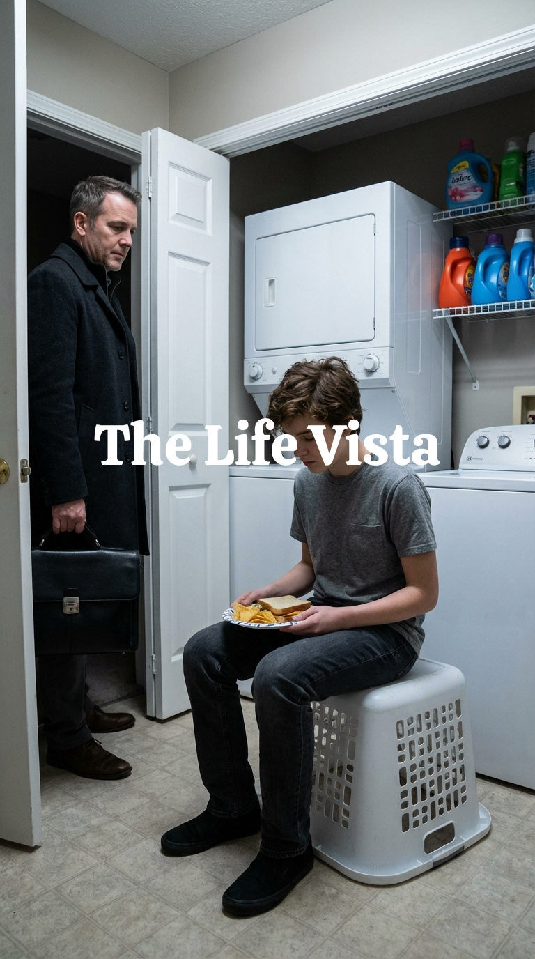 Caleb was sitting on an overturned laundry basket, his plate balanced carefully on his knees, eating with slow, deliberate movements as though he had learned not to rush or draw attention to himself, and for a moment I simply stood there, unable to reconcile the image in front of me with the life I thought we were living. He was ten years old, tall for his age, all elbows and concentration, and when he looked up and saw me, surprise flickered across his face before he smiled, the kind of smile children use when they sense something is wrong but don’t yet know if they’re allowed to say it.