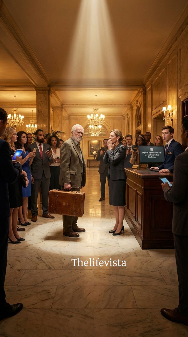 The revolving doors of the Summit Crest Resort spun quietly as an elderly man stepped inside, carrying a modest leather suitcase with worn edges.