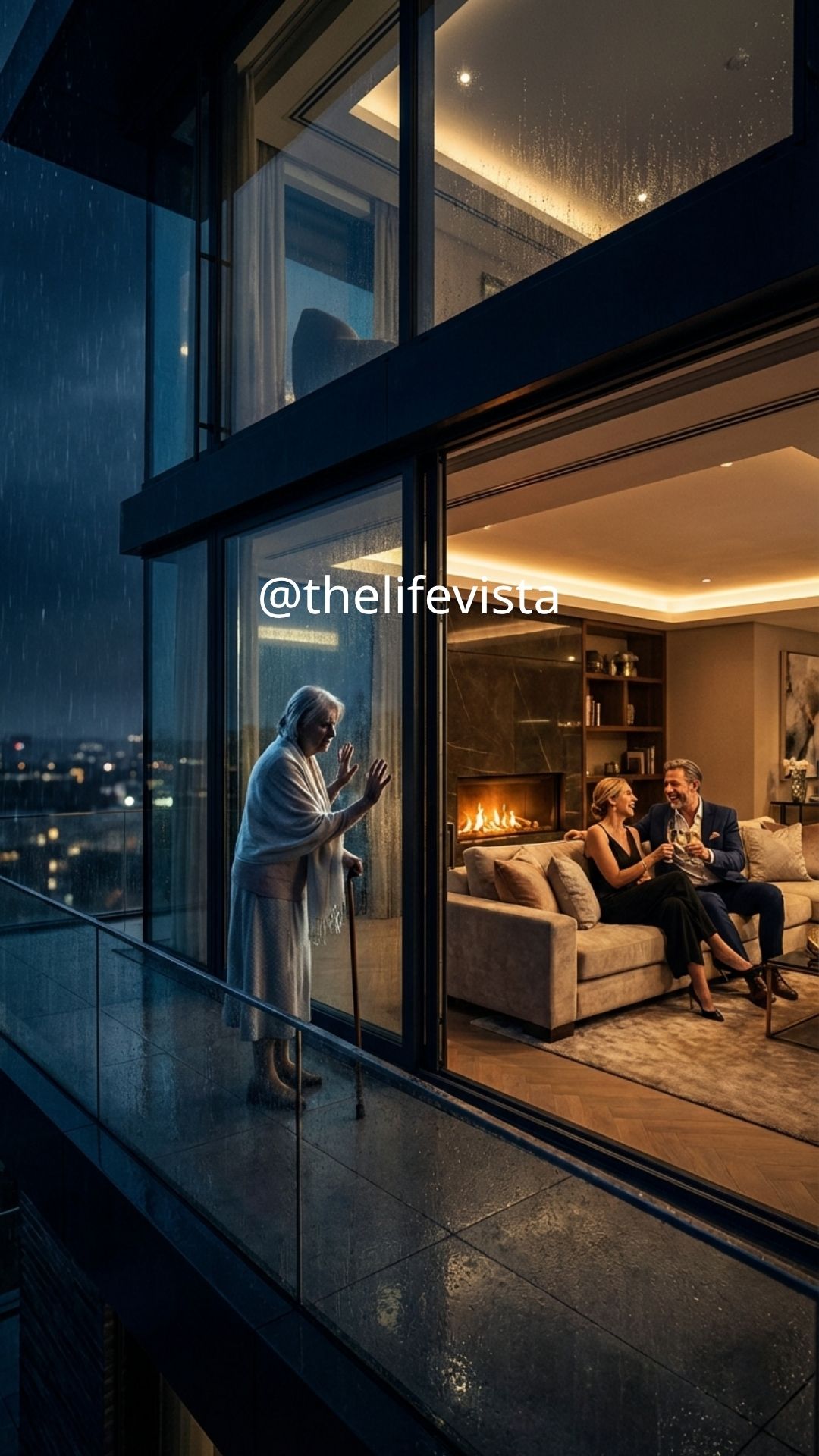 There, on the narrow stone balcony, stood my mother. She was huddled in a corner, shivering violently in a thin silk nightgown. The wind whipped her grey hair across her face. Her hands were pressed against the glass, her fingers scratching feebly, searching for a handle that had been locked from the inside.