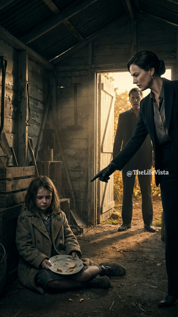 Lucia sat huddled on the cold floor with her knees pulled tightly against her chest. She clutched a small plate in her hands while pieces of food had fallen around her on the dusty ground. Her eyes were red and swollen from silent crying, and although she made no sound, the fear trembling through her body was unmistakable. Standing over her was Valeria, dressed perfectly in a deep burgundy dress with her hair styled flawlessly. Her finger pointed accusingly toward the girl.