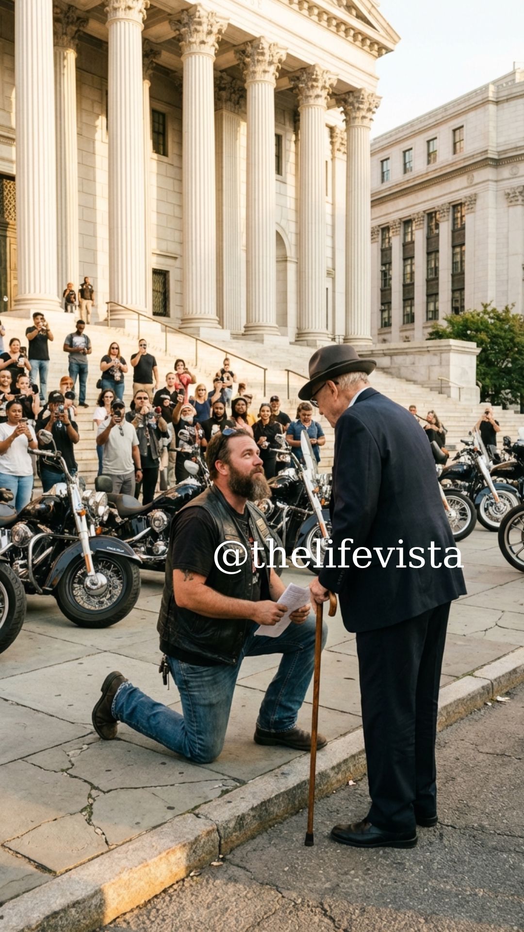 Phones lifted higher as people tried to capture the moment. To them, the scene looked obvious: a biker kneeling before a retired judge. And in stories like that, people assume only one reason.