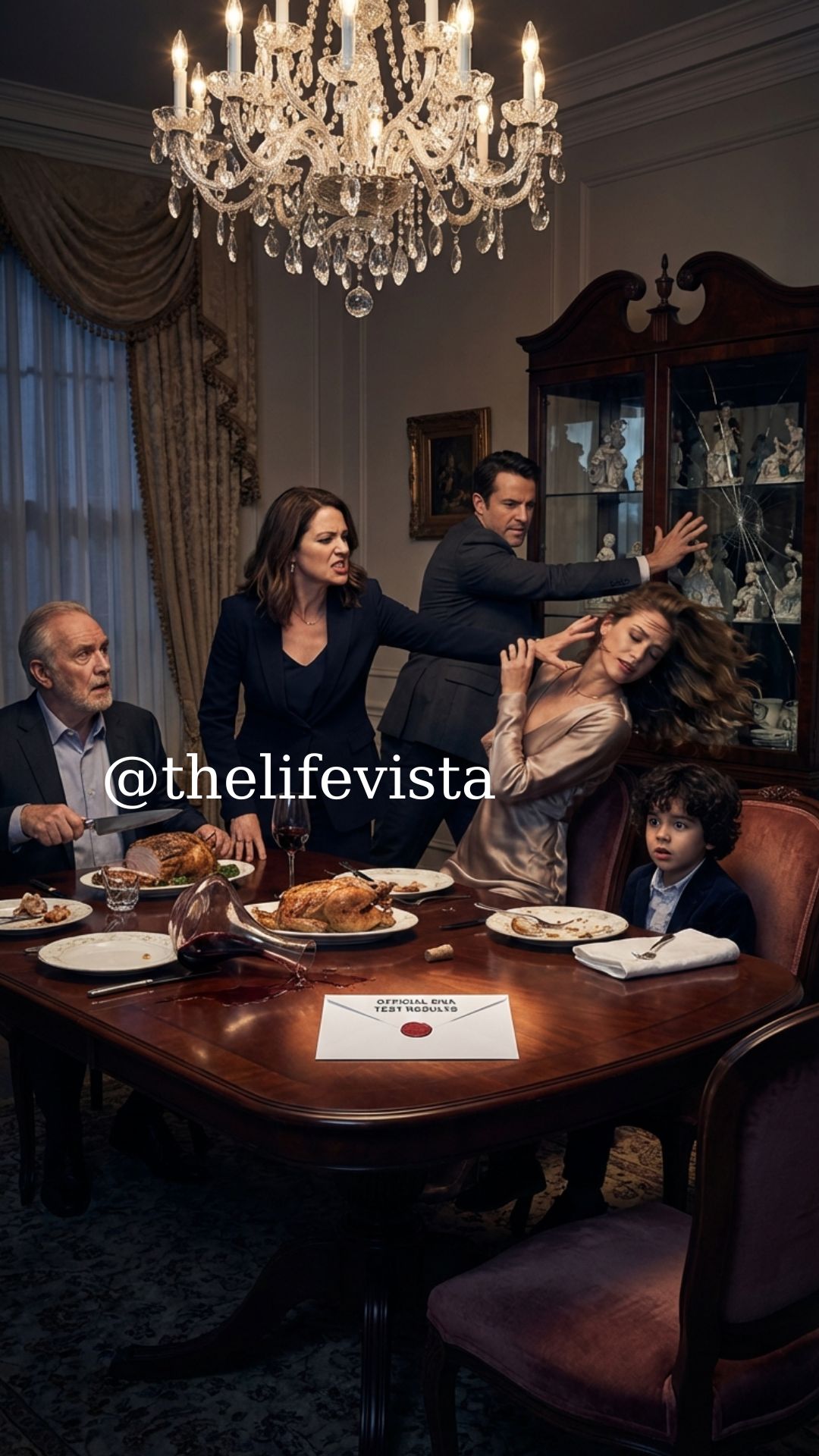 I reached into my handbag, withdrew a large sealed envelope, and placed it in the center of the mahogany dining table. The white paper looked almost too clean against the spilled wine and half-eaten roast chicken.
