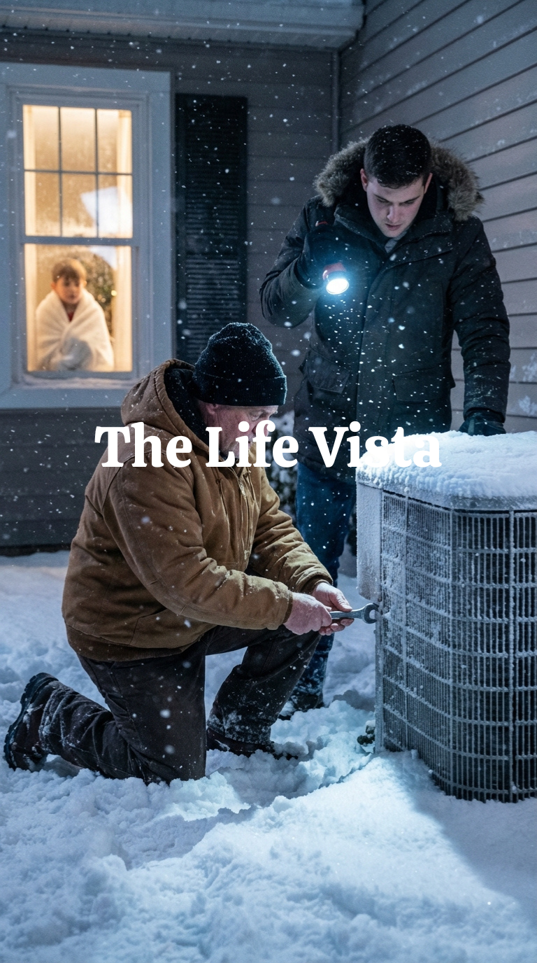Julian was outside in the middle of the blizzard, down on his knees in the snow, kicking at his outdoor heating unit like a man trying to fight a bear with his boots. The thing sat there silent and dead, snow piling up around it, while he cursed loud enough that even through the wind I could see the frustration in the way his shoulders slumped.