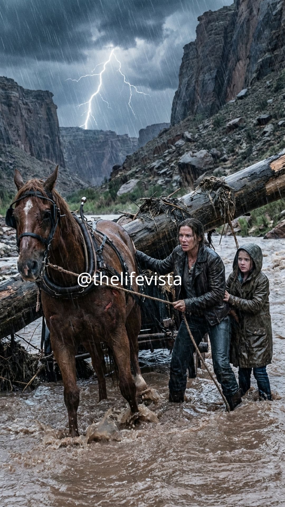 The thunder was not distant. It exploded directly overhead — a violent, splitting roar that seemed to tear through the canyon itself. My mare danced sideways beneath me, her muscles tightening with fear, but I managed to steady her with firm hands and a calm voice.