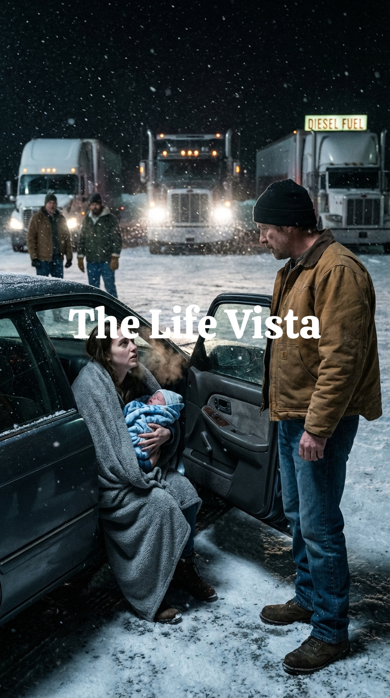 I wrapped my fingers around the tire thumper and stepped down from the cab, boots crunching into fresh snow, already irritated and half-expecting trouble. At that hour, in that stretch of highway, anything parked wrong usually meant something you didn’t want to get involved in—arguments, deals, or desperation that could turn ugly fast. The sedan sat crooked across the last pull-through spot like it had been dropped there by mistake, its dull paint almost swallowed by the white drifting around it. My rig idled fifty feet away, engine humming steady and warm, and all I wanted was to park, shut my eyes for a few hours, and forget the endless miles behind me.