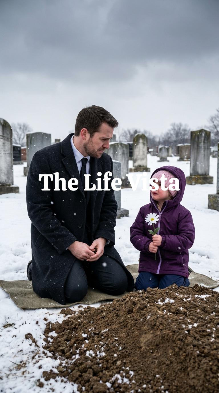I was standing there, hands deep in my coat pockets, preparing to leave, when I noticed a small shape near the base of the grave, something low to the ground and moving in a way that didn’t belong, and when I stepped closer, the world shifted sideways because kneeling in the cold dirt was a little girl, thin as a question mark, her jacket unzipped, her fingers red and trembling as she tried to push a nearly dead daisy into the soil.