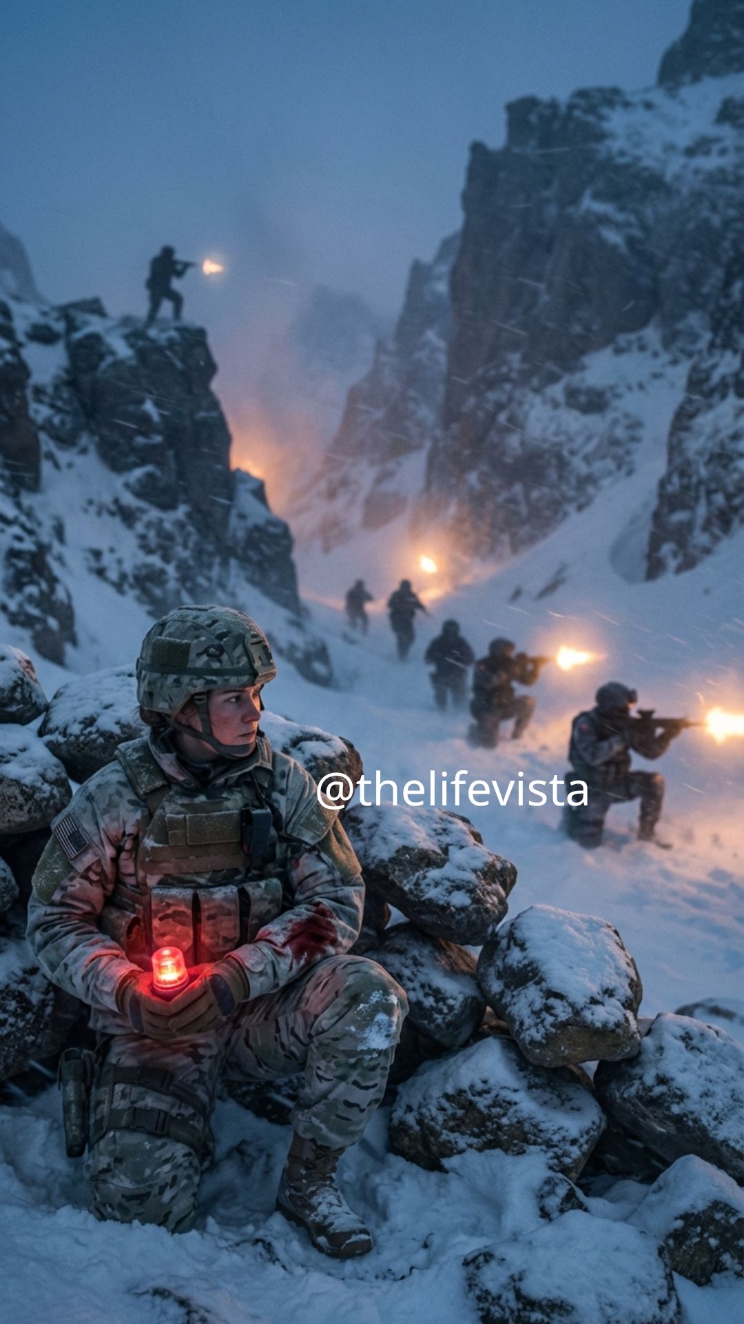 A burst of gunfire answered from the eastern rocks, and then Ryan Brooks finally saw her. She was pinned behind a broken outcrop above the valley, one arm tucked close to her body. Blood had darkened the sleeve of her left side, likely shrapnel or a grazing fragmentation wound. Even through snow and distance, he could tell she was fighting pain with discipline. She kept her wrist raised, angling the homemade IR emitter through the storm in exact intervals. The mysterious sniper on the cliff was making hits at nearly a kilometer in mountain weather. Not lucky hits. Deliberate ones. Each round cut out a position that threatened the team’s route to the hostage site. Ryan Brooks stopped trying to understand how the shooter had climbed there and focused on the only fact that mattered: the unknown man was clearing a path with ruthless efficiency that bought the team precious seconds in an otherwise impossible situation.