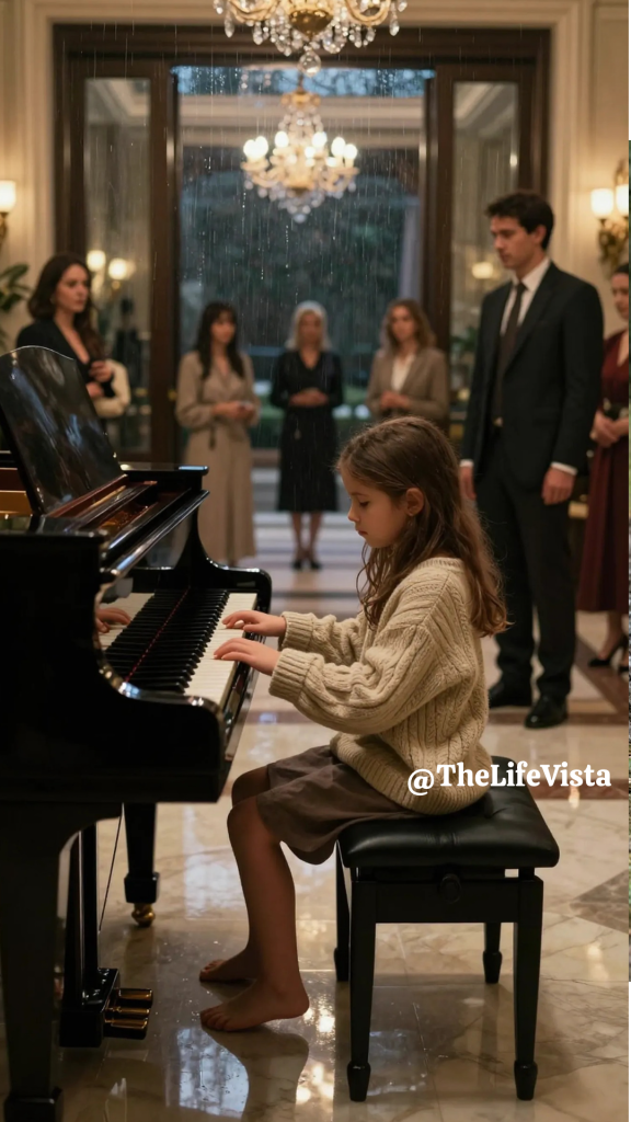 The first note emerged almost like a whisper, tentative but clear, followed by another and then another, and within moments the lobby fell into complete silence. Her fingers moved with an assured calm that did not belong to a child guessing her way through notes, and the melody that unfolded was delicate yet heavy with feeling, carrying sorrow and hope intertwined so tightly they could not be separated. Conversations stopped mid-sentence, footsteps stilled, and no one seemed willing to move or even breathe too loudly. Adrian stood rooted in place, because what he was hearing was not simply skill or raw talent, but something deeper, something shaped by memory and endurance, as if the girl were telling her life story without words. When the final note faded, the quiet lingered for a heartbeat longer before applause broke out, and someone near the elevators wiped at their eyes. Nora turned around in surprise, clearly unaccustomed to being seen that way, and Adrian asked her softly where she had learned to play like that.
