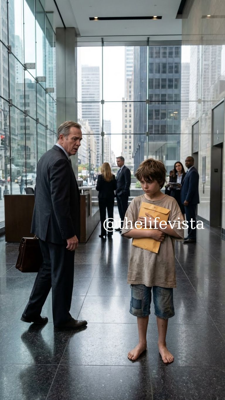 He was thin, sunburned, and barefoot except for a pair of cracked flip-flops that slapped awkwardly against the floor when he shifted his weight. His shirt had once been white, though now it carried the history of many washes and not enough replacements. In his hands, held tightly against his chest as if it might run away, was a thick manila envelope.
