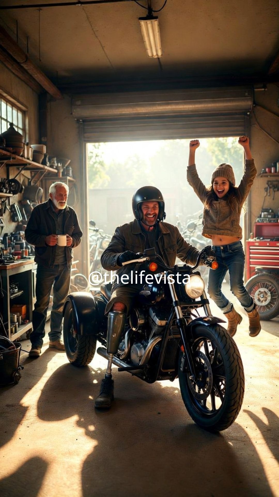 That Saturday, when he showed up at my garage—still unsure, still carrying more doubt than confidence—I realized something important. The hardest part wasn’t teaching him to ride again. It wasn’t the mechanics. It wasn’t the fear. It was convincing him he was still allowed to want it. The moment he sat on that trike, hands resting uncertainly on the controls, engine silent beneath him, the entire space seemed to hold its breath. “I don’t know if I can do this,” he said. “You don’t have to know,” I replied. “You just have to try.” When the engine finally came to life, something flickered across his face. Not memory exactly. Something deeper than that. Recognition. And when he eased forward for the first time—slow, careful, uncertain—it felt like watching someone step back into a version of themselves they thought was gone for good. By the third lap, his posture had changed. By the fifth, he was smiling. Not out of politeness. Not out of obligation. But because something inside him had come back online. His daughter was laughing at the edge of the lot, clapping, calling out to him like she had been waiting for this moment longer than she understood. And when he finally stopped, tears running freely down his face, he looked at me in a way that said more than words ever could. “I thought that part of me was gone,” he said. “It wasn’t gone,” I replied. “Just waiting for you to come back to it.”