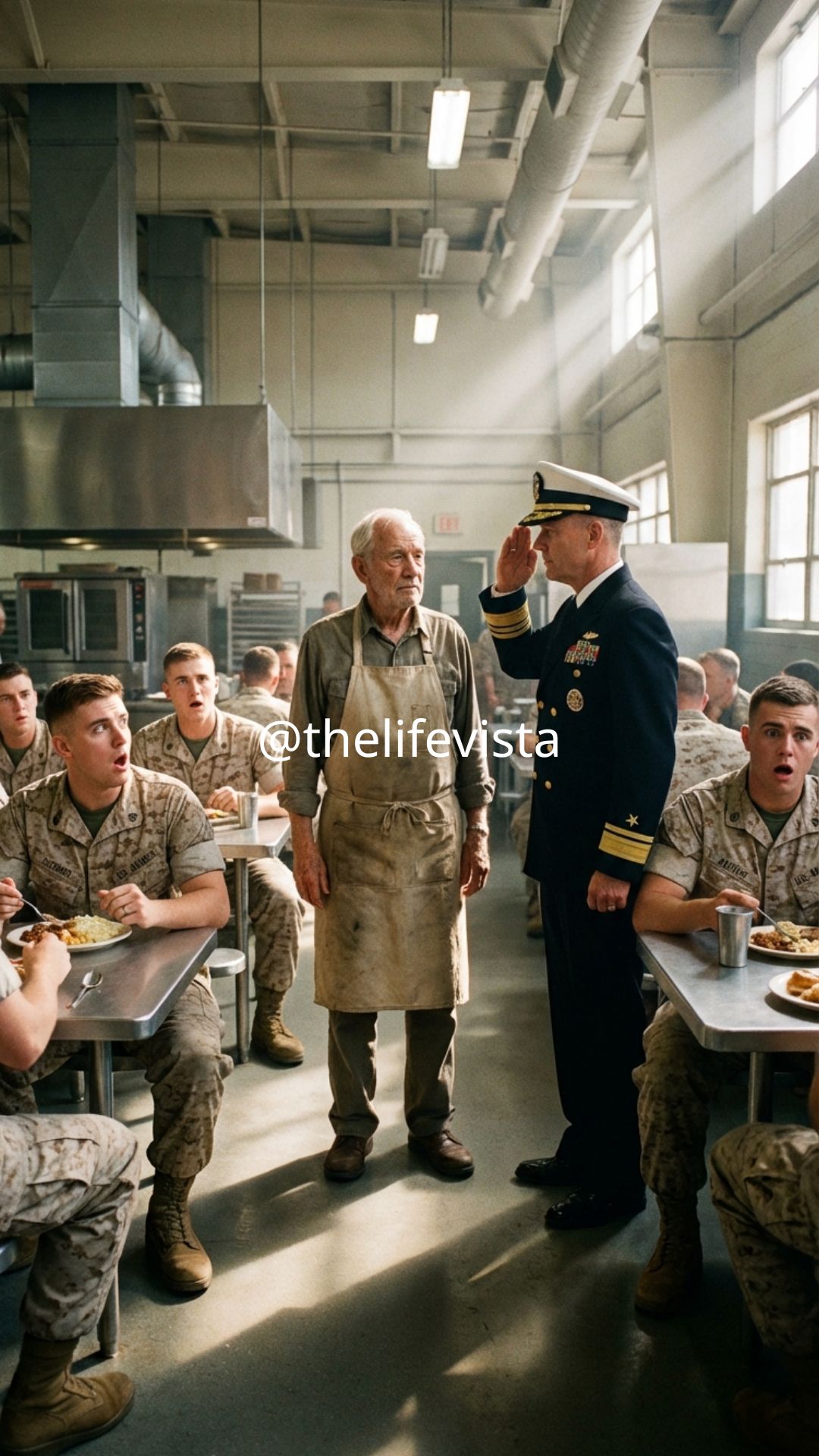 Henry Collins stood behind the serving line, exactly where he stood every weekday at 1145, wearing the same faded kitchen apron and the same expression that most people read as tired, though it was really just stillness. He moved carefully, not slowly, and there was a difference, though very few of the young Marines filing past him ever noticed it. His hands, marked with age and thin blue veins, scooped mashed potatoes with an accuracy that never wavered, portion after portion landing in the same spot on every tray like it had been measured by machine rather than muscle memory.