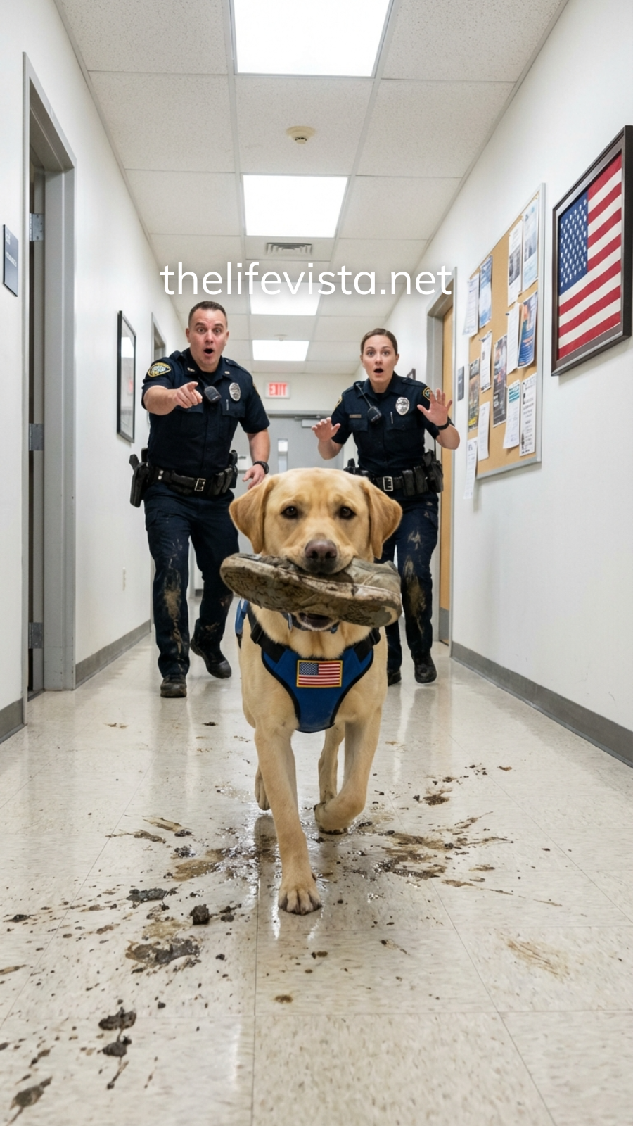 Officer Ryan Delaney said it without looking up from his paperwork, because the morning at the small-town station had been slow and uneventful. The only movement was the rain tapping the windows and the ancient coffee pot sputtering like it was sick of being useful. Then the station’s front door eased open and a Golden Retriever walked in like he had an appointment.
