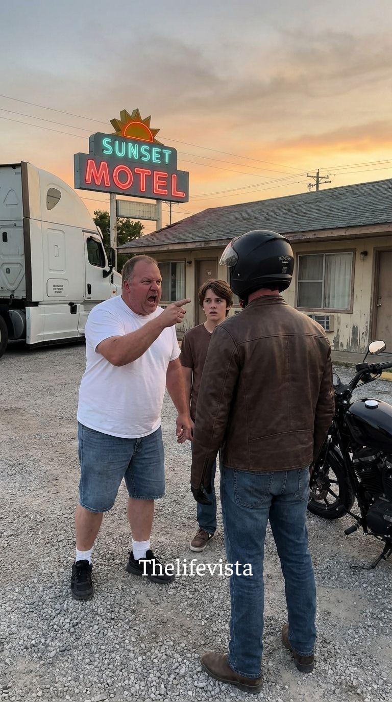 Cracked Gravel Parking Lot Confrontation didn’t start with shouting. It started with the sound of gravel shifting under bare feet and the distant roar of tractor-trailers tearing down Interstate 71 as if the world had somewhere more important to be. The Suncrest Highway Inn sat half-hidden behind a sagging chain-link fence just outside Millers Ridge, Ohio, its faded sign missing two letters and its parking lot more stone than pavement. I had pulled in after driving through the night, parked beside a rusted ice machine, and was leaning against my Ford when the scene began unfolding twenty yards away.