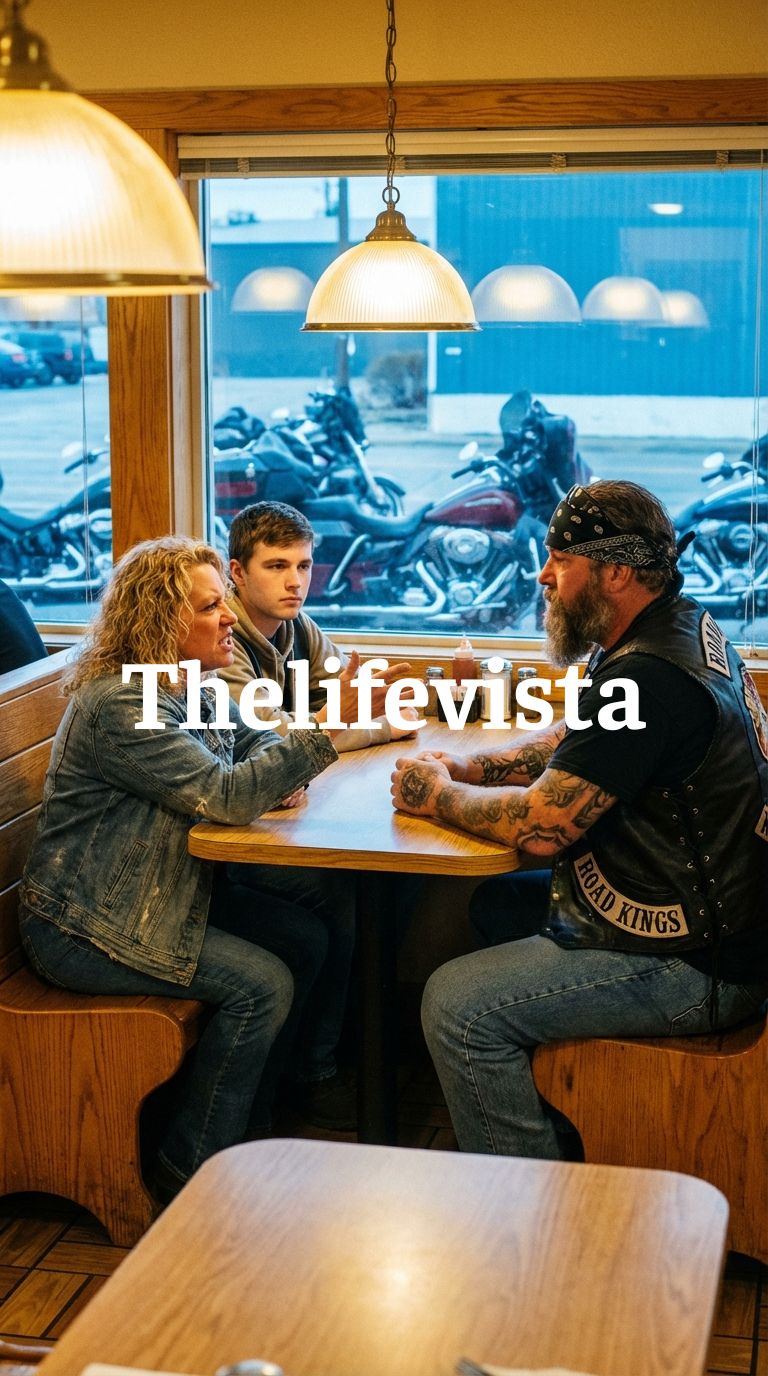 To anyone watching from across the diner, the image looked tense—an imposing, leather-clad stranger facing a child who had just been publicly dismissed.
