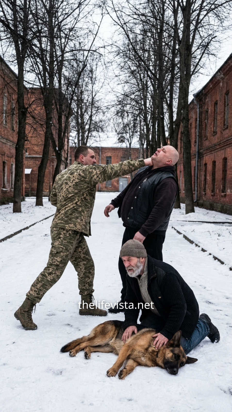 An elderly disabled veteran—missing a leg—was down in the snow, arms raised weakly to shield himself. Beside him stood a golden dog with one cloudy eye—Patch—refusing to leave his owner’s side.