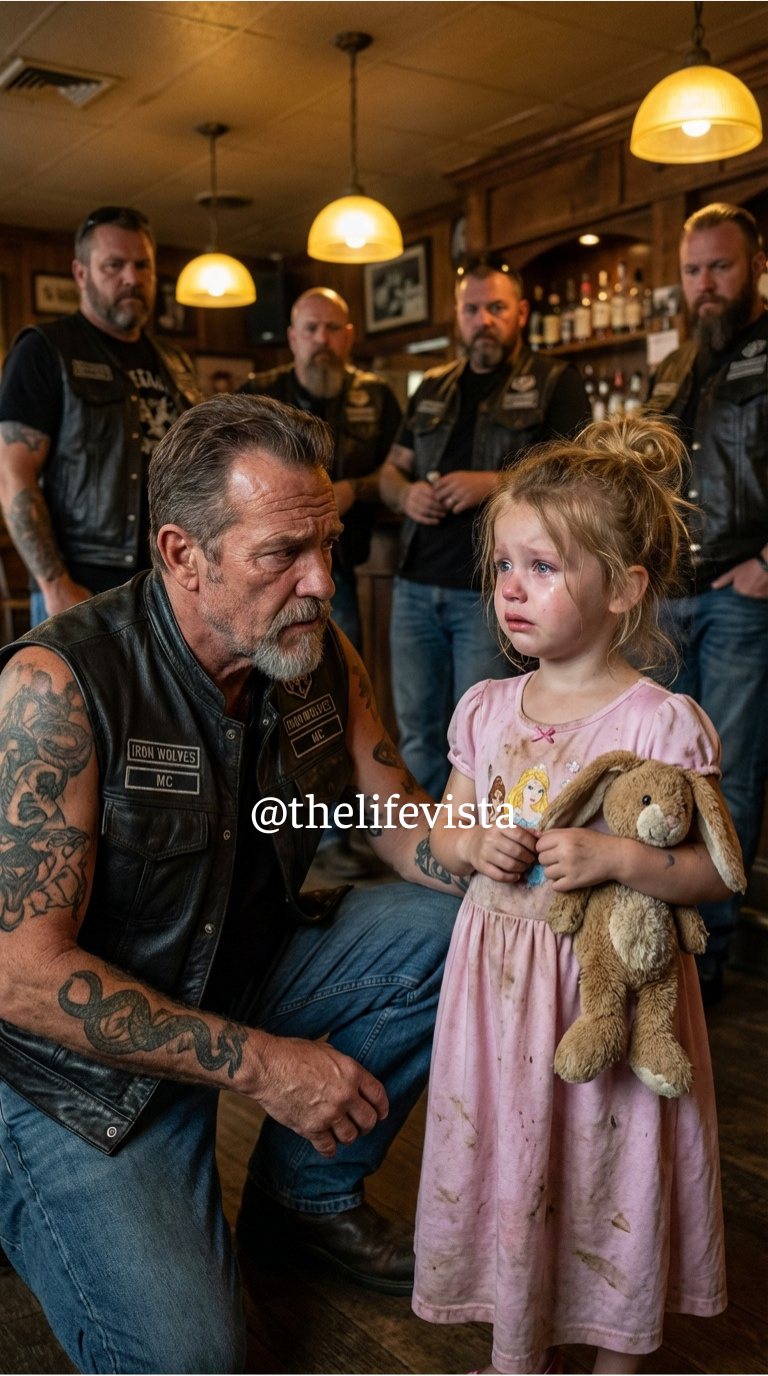 At midnight, just as the last neon sign flickered over the cracked black top, a little girl in faded Disney princess pajamas stumbled into the Steel Wolves biker bar. Tears streaming, voice trembling, clutching a battered stuffed rabbit. Nobody noticed her at first. Not until Rico, the club’s scariest member.