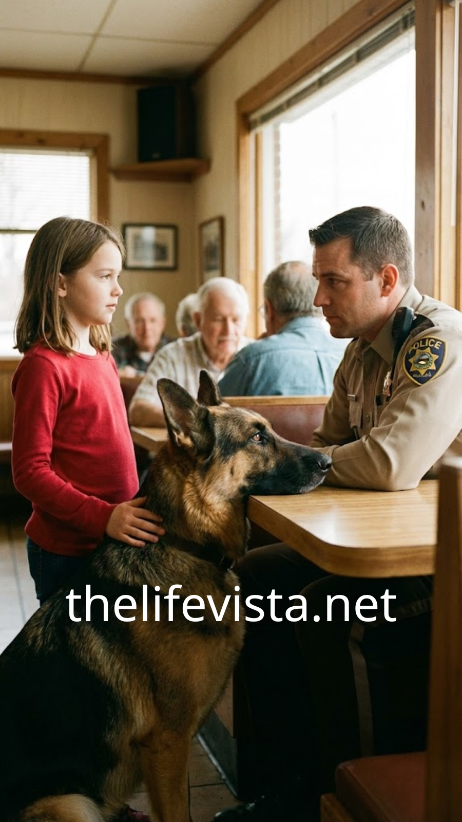 In the far corner of the diner, a small girl in a red shirt and ponytail watched him intently, her eyes wide and thoughtful. Beside her was the massive German Shepherd, still and alert, his gaze fixed on the officer as if studying him. The girl stood up. She wasn’t more than ten.