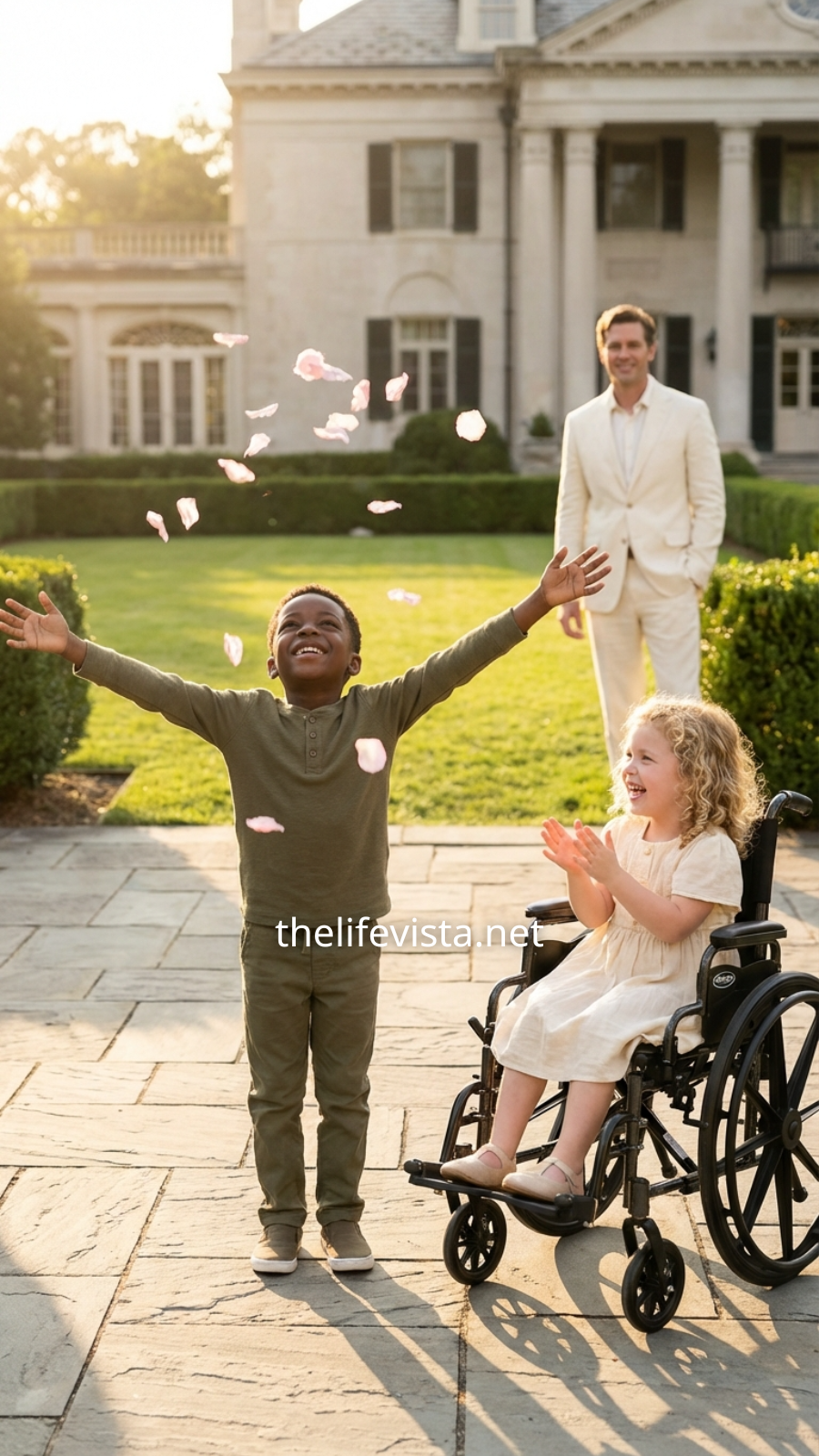 On the grass below, his nine-year-old daughter Lily, who had been paralyzed from the waist down since birth, sat in her wheelchair, clapping her hands with pure excitement. Her laughter rang across the garden. In front of her, a boy about her age spun around wildly on the lawn, arms stretched wide as he twirled through the falling petals.