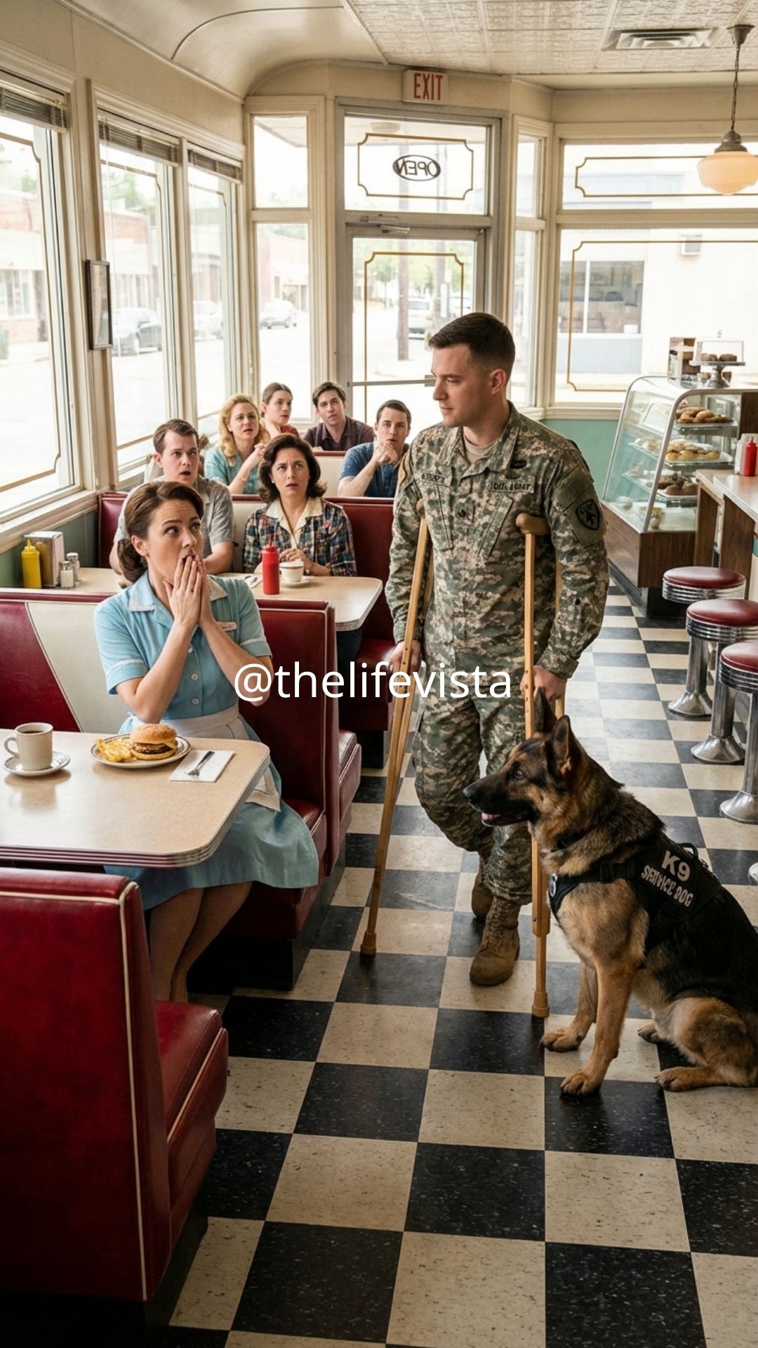 For the first time since walking into the diner, the veteran’s guarded expression softened slightly. He moved toward the counter carefully, positioning the crutch against the side of the stool before lowering himself onto the seat. The German Shepherd settled beside him without needing a command. For a moment, the diner returned to its normal rhythm.
