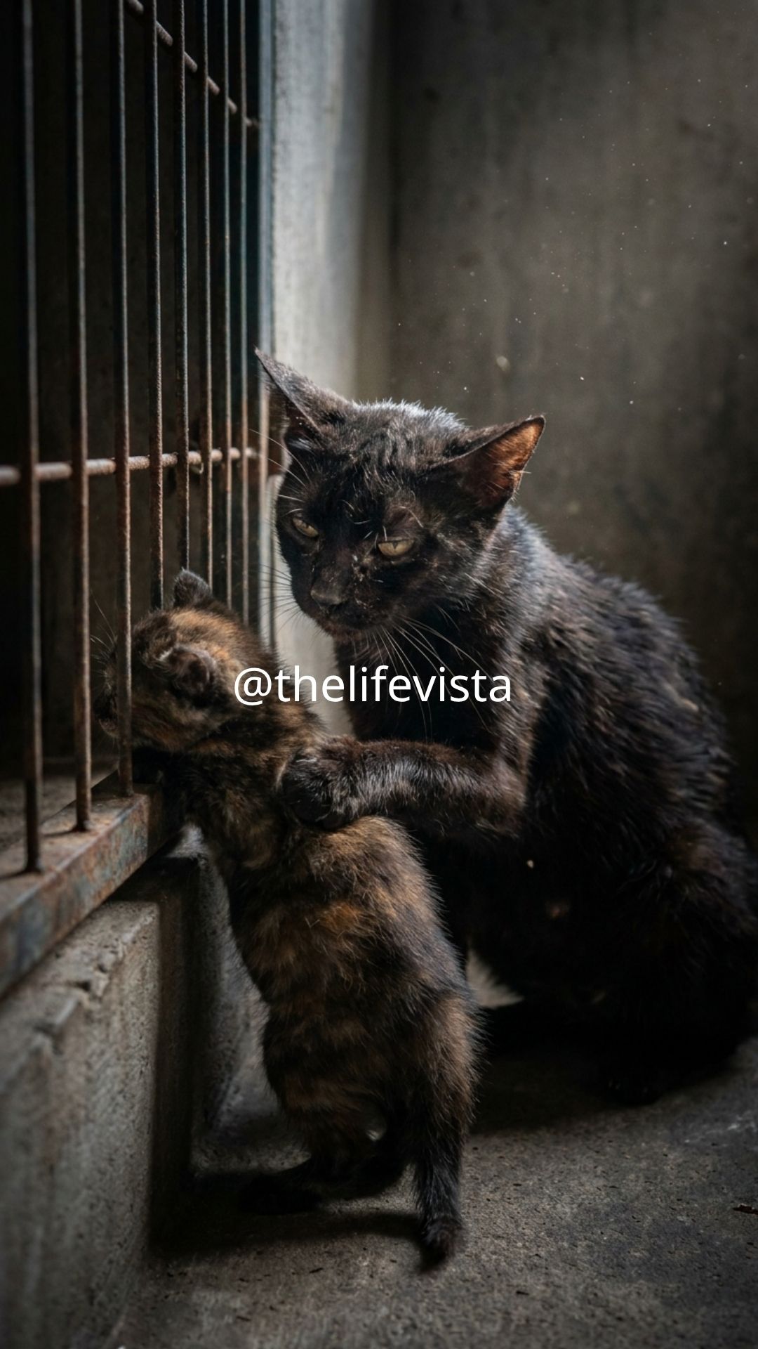 The mother cat stood at the front of the cage, holding her kitten gently by the scruff. There was no panic in her movements, no frantic energy—only focus.