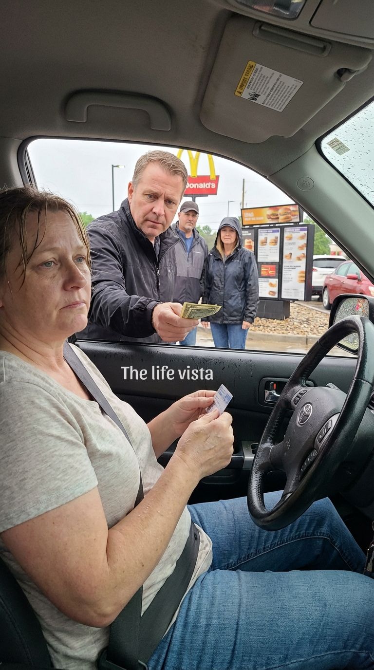 She straightened immediately, wiping her face with the back of her hand as if she could erase the evidence of what she was feeling, and when she said, “It’s fine,” it sounded like she had said those exact words a hundred times before in situations that were anything but. I was reaching to hand her card back when the knock came, sudden and solid against the outside wall, and for a second all three of us turned at the same time, as if something had interrupted not just the transaction, but the entire direction the moment was heading. The man standing in the rain, Thatcher, looked like he had stepped out of a different kind of life entirely, his jacket darkened by water, his cap pulled low, his posture steady in a way that suggested he had spent years doing things that required patience more than comfort, and when he held out a twenty-dollar bill through the window, he didn’t hesitate, didn’t ask permission, didn’t soften the gesture with a smile.