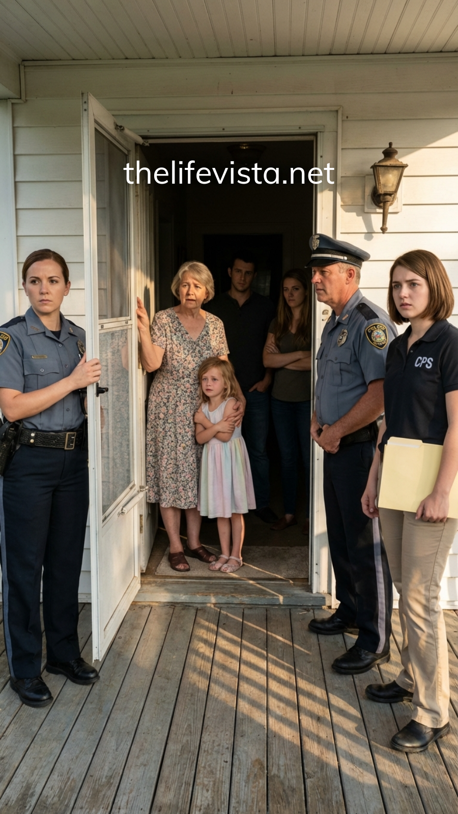 Two police officers stood there—one woman, one man. Behind them was a CPS caseworker holding a clipboard, her face calm but serious.