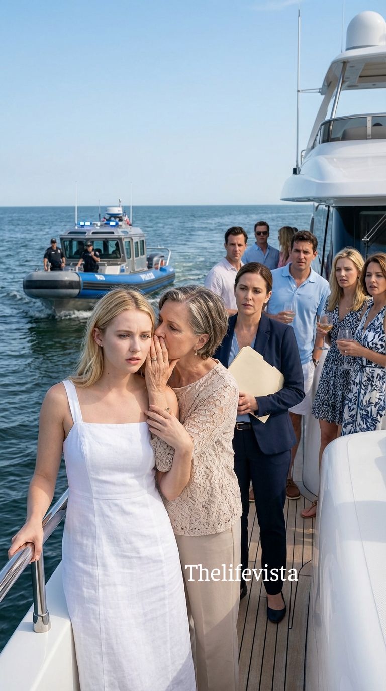 Red and blue lights flickered on the horizon as a police patrol boat approached, cutting through the yacht’s wake with controlled authority.
