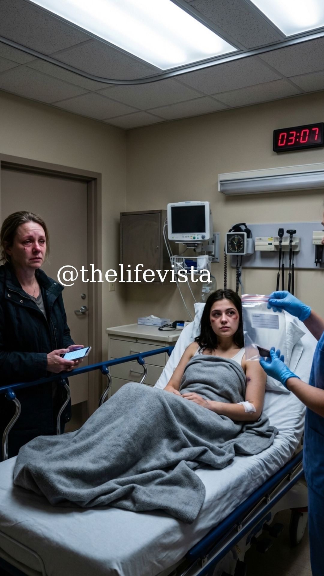 Evelyn didn’t remember sitting; one moment she was standing, the next she was gripping the arms of a plastic chair while the room hummed under fluorescent light. The woman on the gurney watched her like a skittish animal, blanket clutched tight.