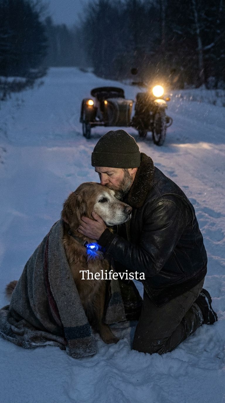 The ride back toward town was a blur of white and adrenaline, the bike bucking under me as snow swallowed the road, and every few seconds I reached back to touch the bundle in the sidecar, as if my hand alone could keep the dog anchored to the world.